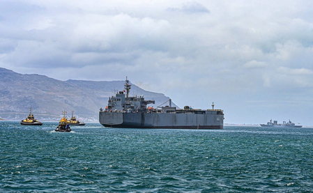 साउथ अफ्रीकन नेशनल डिफेंस फोर्स ने गुरुवार को पीपल्स लिबरेशन आर्मी नेवी (प्लान) के डिस्ट्रॉयर सीएनएस तांगशान (122), फ्लीट ऑइलर सीएनएस ताइहू (889) और ईरानी नेवी एक्सपेडिशनरी सी बेस आईरिस मकरान (441) के साइमन टाउन पहुंचने की तस्वीरें जारी कीं। साउथ अफ्रीकन नेवी का फ्रिगेट एसएएस अमाटोला (एफ145) भी बेस पर डॉक किया गया था।